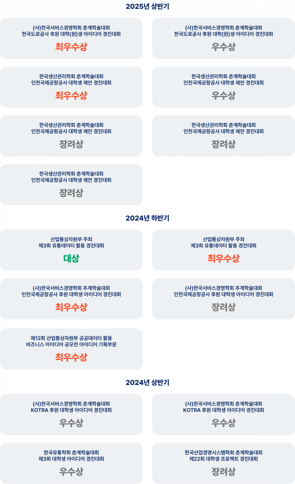 특히 해당 학회의 대회들은 대부분 관련 기업이 후원함으로써 기업의 실무적 문제에 대해 대학생의 시각에서 오퍼레이션스 전략을 제언하는 기회를 제공합니다. 대외활동을 통해 팀워크에 기반한 아이디어 디벨롭핑 능력, 그리고 특정 산업내 실무적 이슈와 전략 도출 역량을 함양하고 있습니다.