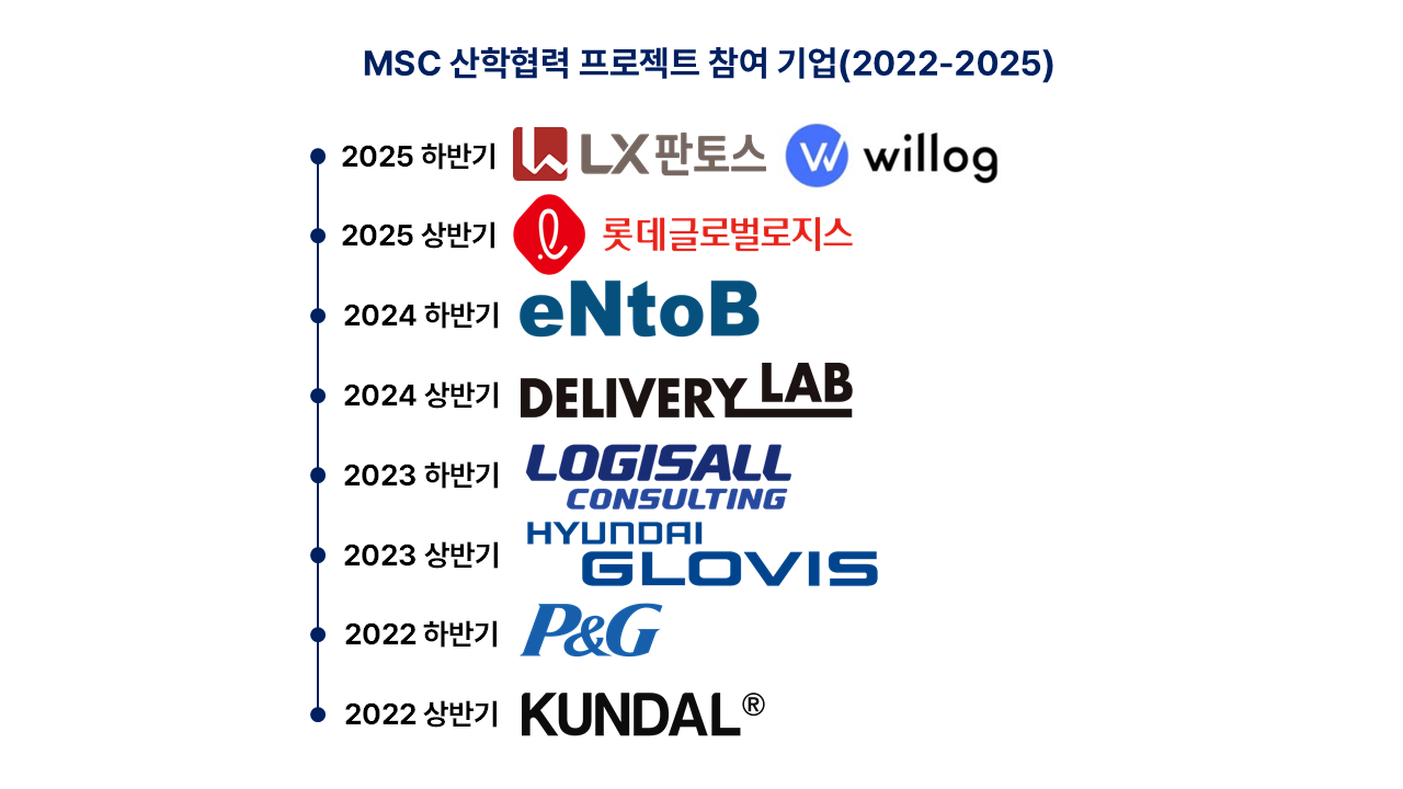 2025년 상반기에는 택배/SCM/국제물류/컨설팅 등 물류 서비스를 제공하는 롯데그룹 계열의 종합물류기업 '롯데글로벌로지스'와 연계하여 기업의 핵심 사업인 ‘자율주행 물류’와 ‘CFC(Customer Fulfillment Center) 즉시배송’ 등 두 가지 테마를 주제로 '국내 자율주행 화물차 미들마일 최적 환승 거점 도출', '수리모델로 접근하는 자율주행 화물차 최적 환승 거점 경제성 분석', 'E-Grocery 고객 경험 혁신을 위한 찾아가는 시식코너 배송', '국내 농산물 수출기업을 위한 글로벌 풀콜드체인 수출 물류망 구축' 프로젝트를 수행했습니다.