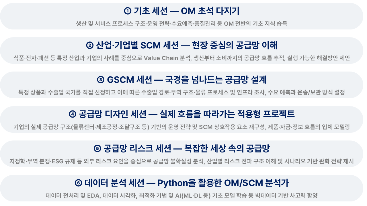 매주 수요일 경영관에서 진행되는 MSC의 정기세션은 경쟁PT 방식에 기반을 두고 있습니다. 학회원들과 매 세션마다 새로운 구성의 팀을 이루어 단기간에 효과적이고 효율적인 경영 리서치 수행 역량, 체계적 흐름의 비즈니스 장표 제작 역량, PT 역량을 향상하는 것을 목표로 합니다. 매 학기 산업/기업별 SCM 분석, 공급망 설계, 데이터 분석 등의 세션을 진행하고 있습니다.